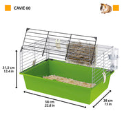 Cavie 60 es una jaula para conejo con un reciente renovado sistema de apertura y cierre, garantizando total seguridad para sus mascotas. El hábitat tiene una estructura tradicional con una base de plástico y una estructura de malla de alambre barnizado. En la parte frontal, la puerta puede abrirse completamente, para facilitar la limpieza. Dentro, encontrará accesorios, incluyendo un bebedero y un alimentador plástico para heno.