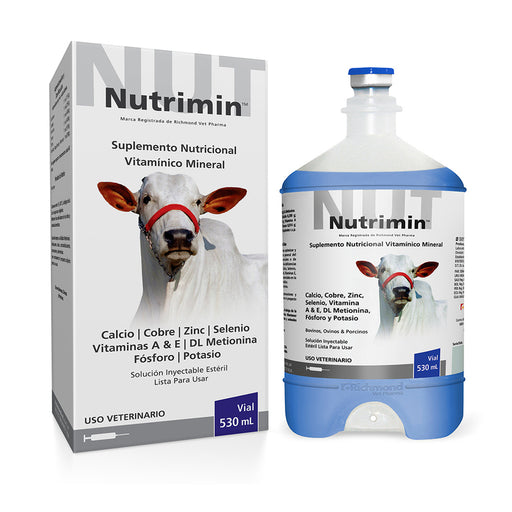 NUTRIMIN es un suplemento nutricional inyectable. Cloruro de calcio 0,014 g Vitamina A 0,150 g Vitamina E 0,750 g Edetato de Cobre y Zinc 22,500 m...